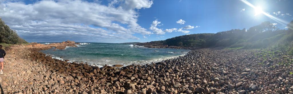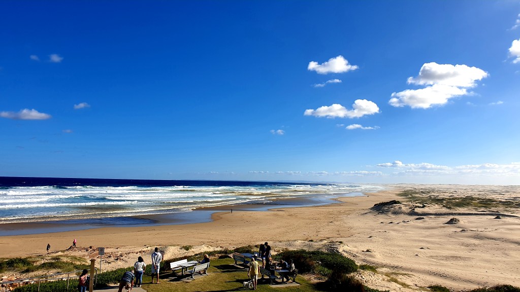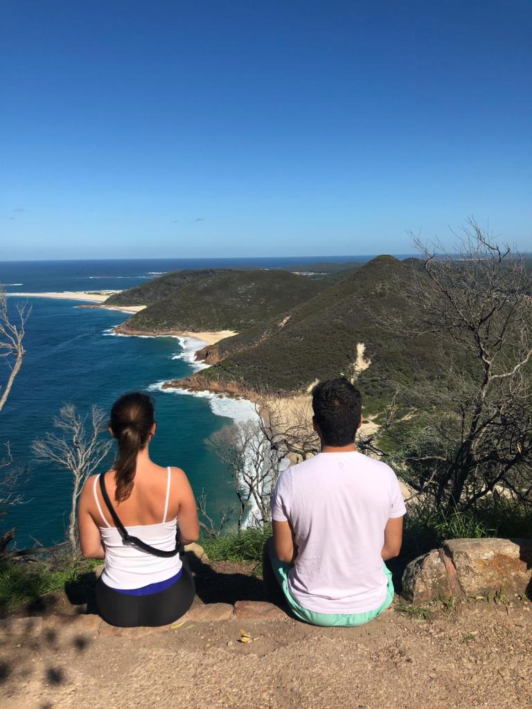 Après un petit-déjeuner sur l’herbe, nous nous dirigeons vers Zénith beach, à Port Stephens. Au bout d’un kilomètre d’escaliers, nous atteignons le sommet où la vue sur la plage est à couper le souffle.