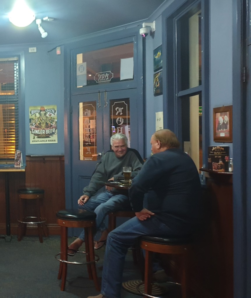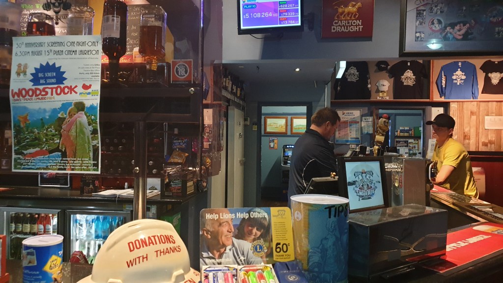 Le serveur lambine et c’est difficile de s’impatienter. Margot et Maëva me demandent pourquoi il prend autant de temps à nous servir. Il faut croire qu’il est habitué à avoir peu de clients. En effet, nous sommes les seuls dans le bar, à l’exception de deux australiens proches de la soixantaine qui sirotent une bière bon marché assis à une table ronde. Comme dans beaucoup de petits pubs campagnards de ce genre, une pièce est consacrée aux jeux d’argent, les “pokies”, aux paris et au billard.