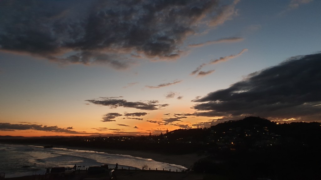 Le réveil est bien matinal sur ce terrain de foot qui jouxte un champs où paissent des vaches. Nous faisons un peu d’exercice physique, quelques tours de terrain puis prenons la route pour Byron Bay. Ah, Byron Bay. Une de mes villes préférées. Nous arrivons à la nuit tombée dans un camping près de la plage.