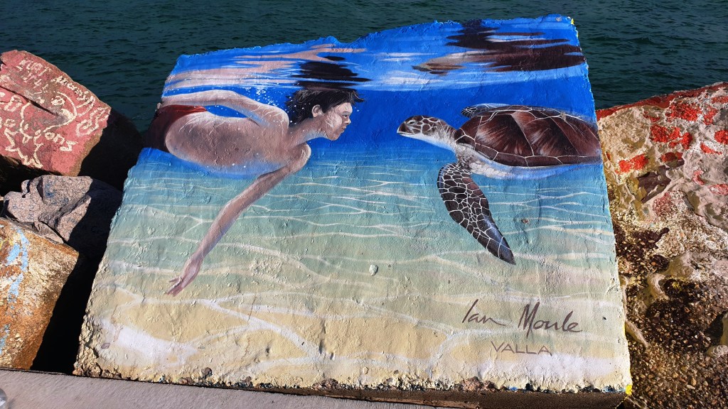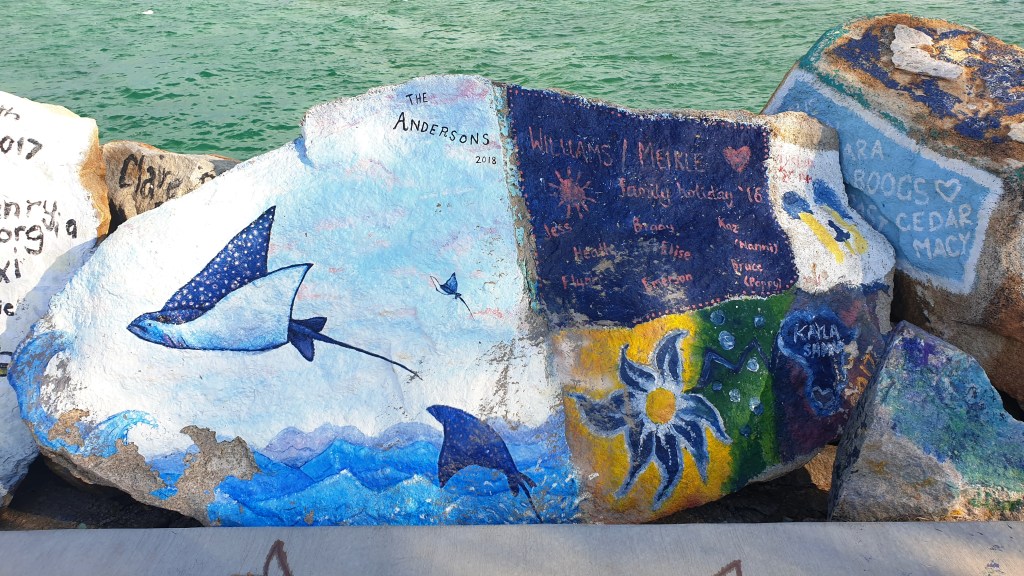 Nous nous arrêtons devant la mer, et longeons un petit mur fait de grandes pierres. Elles sont toutes couvertes de peintures et de décorations. Elles permettent de se rappeler certaines personnes décédées, font figurer des dessins d’enfants, des poèmes d’amour et des déclarations d’amitié, des animaux, des familles, des proverbes, parfois même des traits d’esprit. Pas une seule pierre n’est restée vierge, et il faudrait des heures pour toutes les lire.