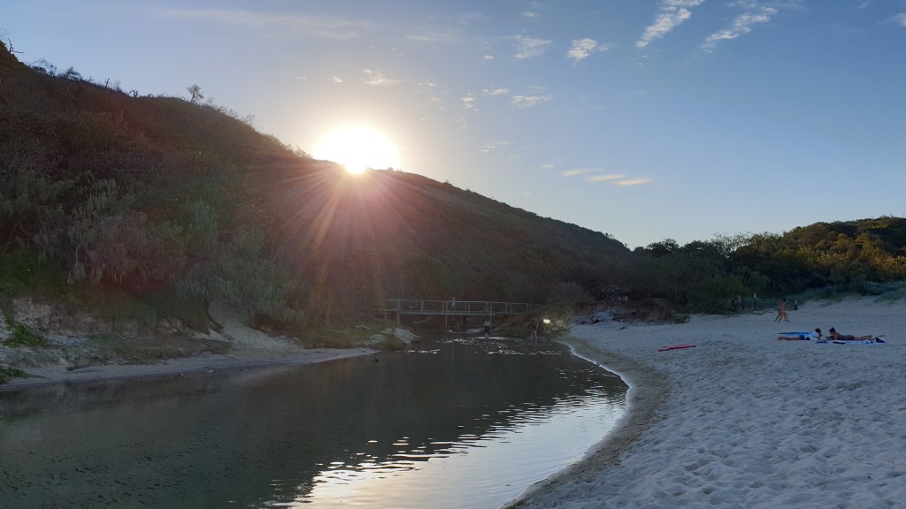 Nous reprenons notre route, en direction de Noosa (qui signifie “endroit ombragé” en Aborigène), une petite ville côtière très mignonne. Nous arrivons pour le coucher de soleil à la plage de Noosa patrouillée par des sauveteurs, comme la plupart des plages australiennes.