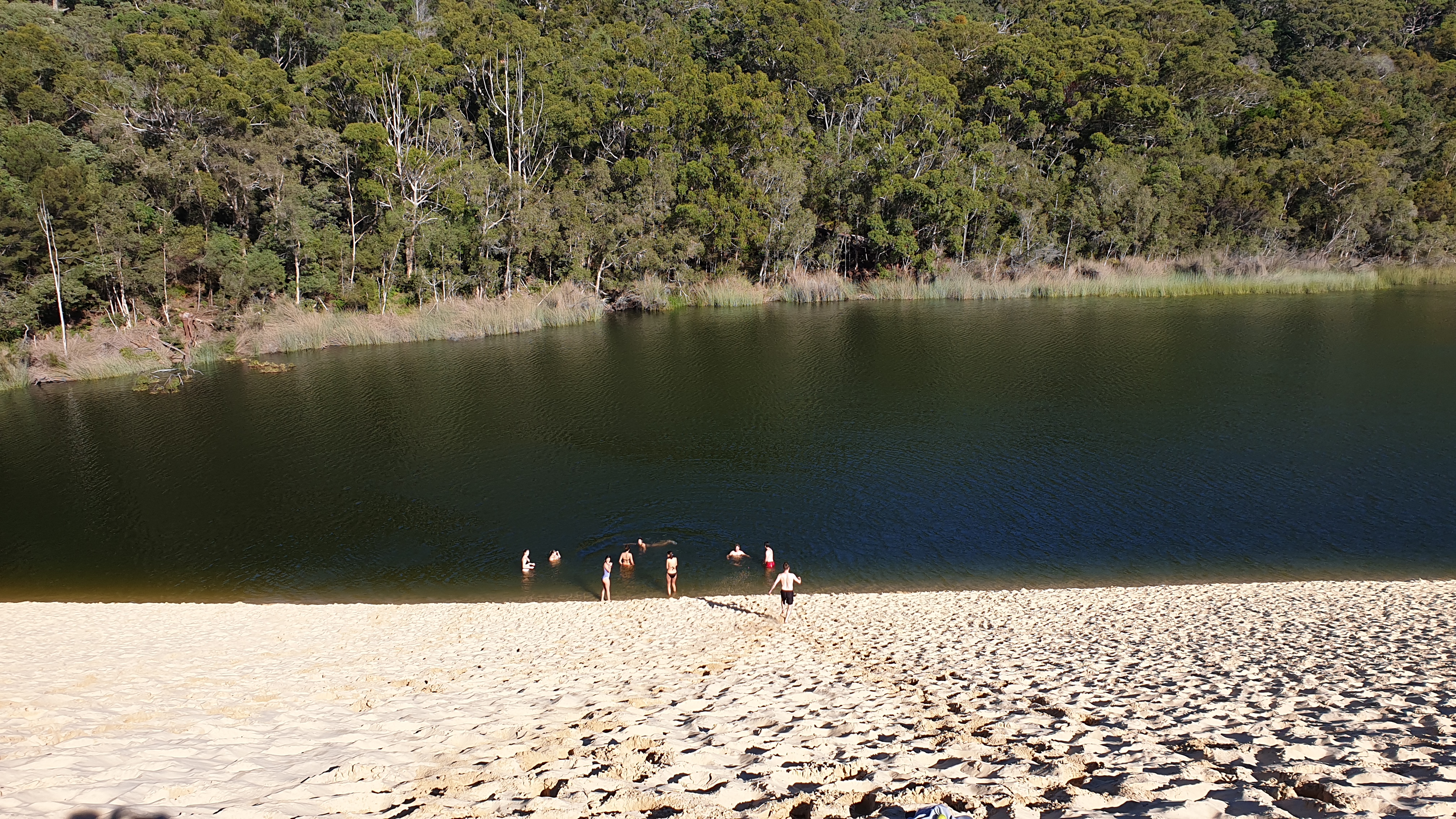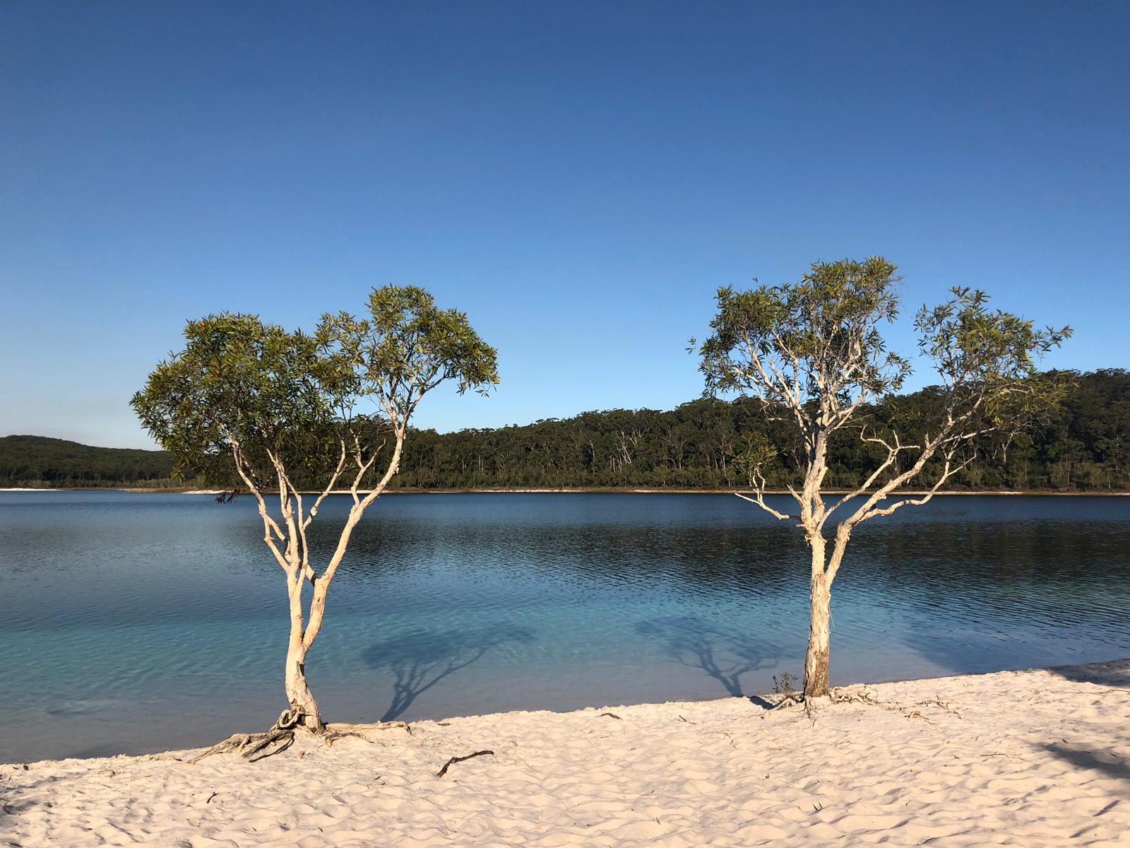 Arrivés au lac Mc Kenzie, nous n’en croyons pas nos yeux. S’offre à nous une étendue immense d’eau douce dans laquelle nous plongeons. Si le lac est très clair près du sable, il devient turquoise au fur et à mesure que l’on s’en éloigne puis bleu profond à partir de quelques mètres. Ce qui m’impressionne, c’est de voir cette eau turquoise mais douce et de pouvoir la boire.