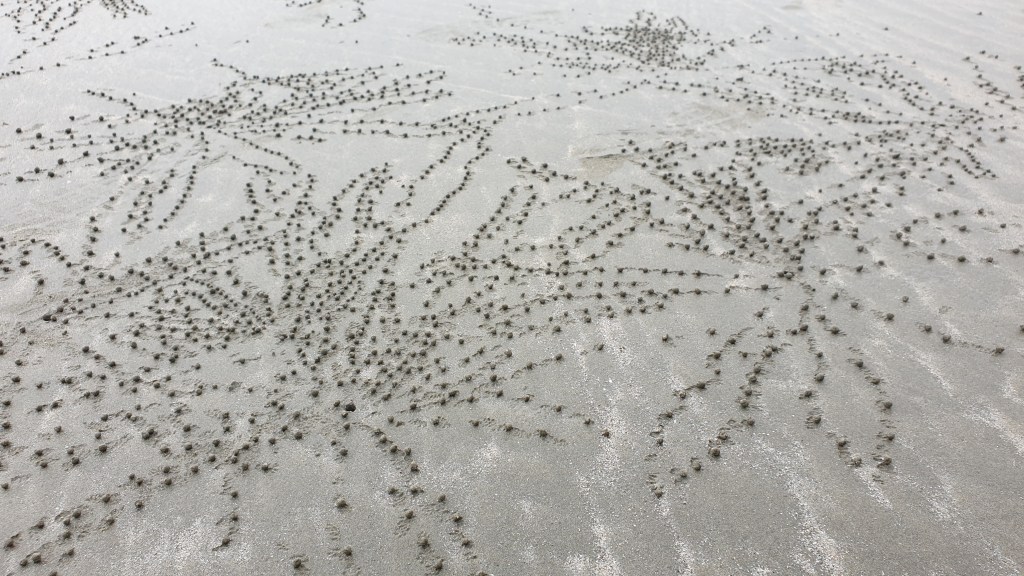 Sur la route, nous nous arrêtons à un des endroits qui m’a le plus marquée du fait de sa plage curieuse et déserte. Là, des milliers de minuscules boules de sable se sont formées par l’action des crabes qui logent ici. Le résultat est impressionnant, et digne d’une oeuvre d’art. C’est exactement ça, on dirait une oeuvre d’art Aborigène.