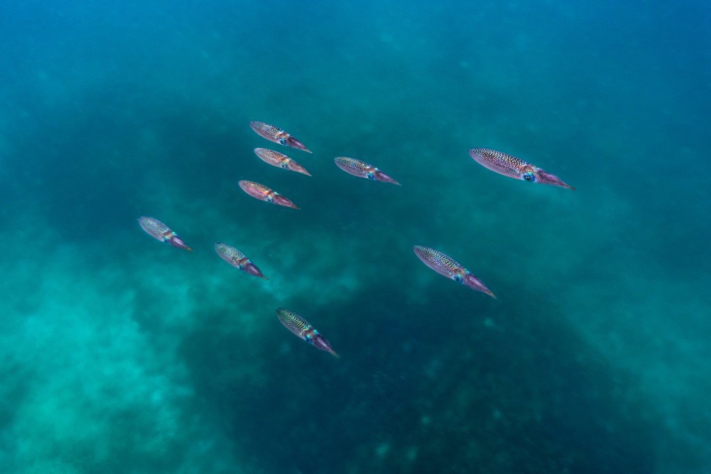 Plus tard, une tortue plus petite file tout près de moi, et fait miroiter ses écailles brillantes dans l’obscurité de l’océan. Un banc de merles passe à toute vitesse, un couple de raies pastenague se sauve.