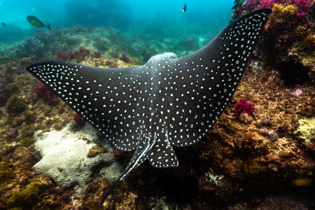 C’est toujours un moment fabuleusement agréable, quand notre corps est plongé dans l’eau ; le paroxysme de ce plaisir : lorsque notre nuque fragile, douce et chaude entre au contact de l’eau glacée. Un monde de merveille se découvre à mes yeux. Car bien que j’aie été habituée aux coraux phosphorescents et poissons arc-en-ciel du lagon de Moorea, l’écosystème marin local m’étourdit. C’est un bleu profond où se promènent algues en suspension, raies, où se prélassent requins dormeurs tout au fond. C’est drôle, ces requins ne font pas cas des humains qui les regardent avec des yeux écarquillés, mais ils n’en sont pas moins impressionnants et saisissants.