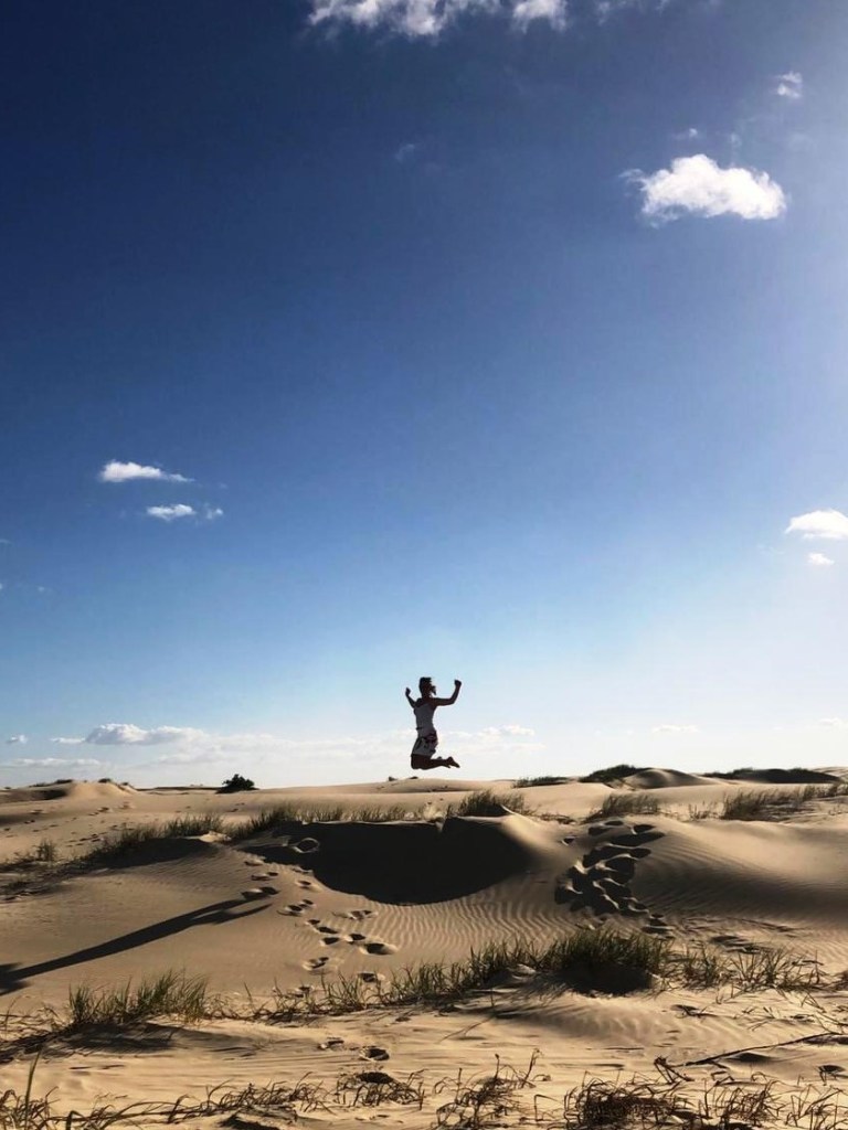 Nous restons là un moment, avant de reprendre la route en Jeep vers un lac. Nous garons la voiture puis montons à pied un sentier pour atteindre le lac Wobby. Le lac est bordé d’une immense dune de sable qui l’engloutira dans quelques années. La forêt dense et la dune dorée qui l’encerclent lui donnent une couleur émeraude. Nous dévalons la pente de sable à toute vitesse avant de plonger dans l’eau à la température fraîche et à l’odeur de souffre. Nous nageons jusqu’au rivage, de drôles d’algues chatouillent nos orteils.