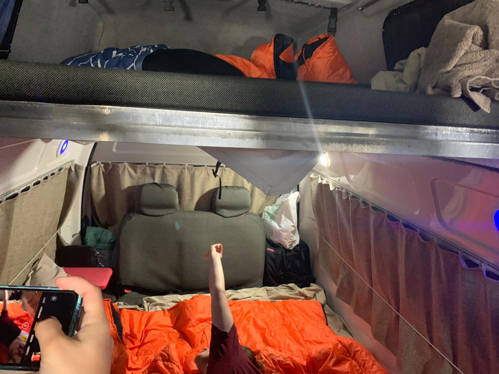 Ah, ce fameux couchage, celui qui a nécessité 4 cerveaux adultes et pas moins d’une demi-heure pour être mis en place. D’abord, il faut trouver la planche, celle qui servira de base pour poser le matelas. Ensuite, réussir le puzzle des coussins qui serviront de matelas. Une fois qu’on a agencé un semblant de lit, organiser les planches de la partie supérieure du van où 1 mètre carré et demi de surface à 20 cm du toit nous servira de couchette à Francisco et à moi.