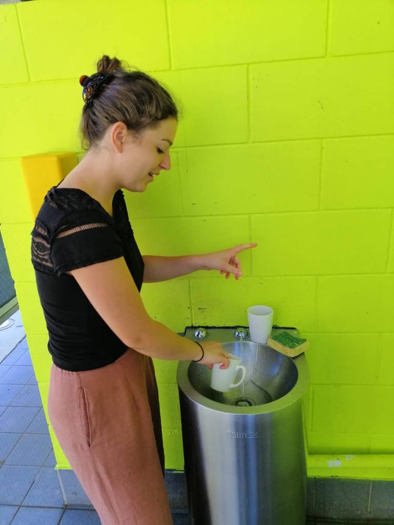 Maëva et Margot ont emprunté à la taverne quatre chaises et une table et nous sommes confortablement installés. Nous remplissons le réservoir d’eau à l’aide de bouteilles vides et de plusieurs aller-retour aux toilettes.