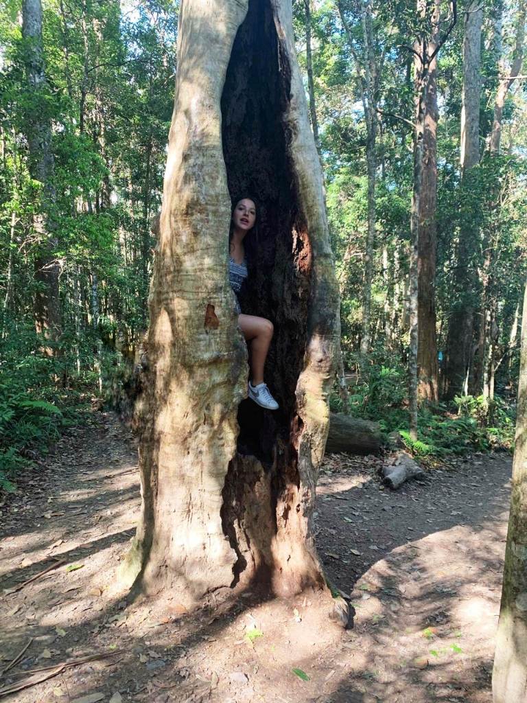 A 91 kilomètres au nord de Brisbane, le parc de Kondalilla (« eau courante », en Aborigène) est source d’émerveillement. Tout d’abord, les multiples petites cascades qui se succèdent donnent envie de s’y plonger tout entier. Ensuite, la flore est incroyablement luxuriante. Nous sillonnons les sentiers en nous arrêtant régulièrement pour admirer quelque arbre exotique ou oiseau coloré. Je découvre un arbre debout mais creux, la cachette parfaite !