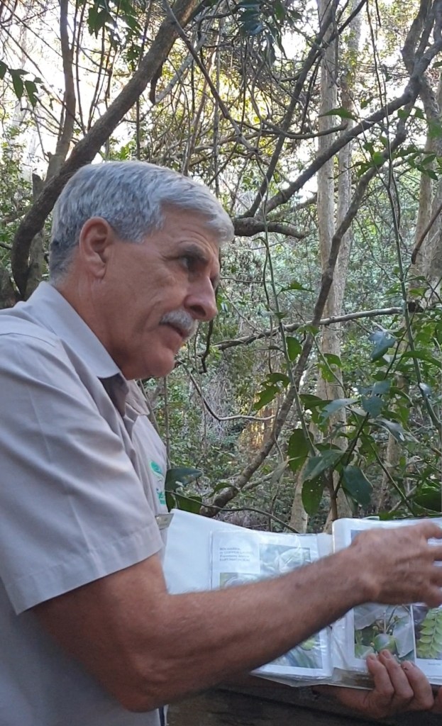 Cette forêt vierge renferme de véritables trésors, tant dans sa faune que dans sa flore, et surtout, contient tout ce dont les Biripai avaient besoin pour vivre. Un homme proche des 70 ans se porte volontaire pour nous faire visiter l’endroit. Sa masse de cheveux et sa moustache fournie m’impressionnent. Il promène avec lui un petit livre qui visiblement renferme tous les secrets de cette forêt tropicale. Commence la visite, on voit que le monsieur met du cœur à l’ouvrage. Nous découvrons des arbres immenses et de toutes sortes, dont un qui m’a beaucoup marquée par sa beauté et son histoire insolite : le figuier étrangleur.