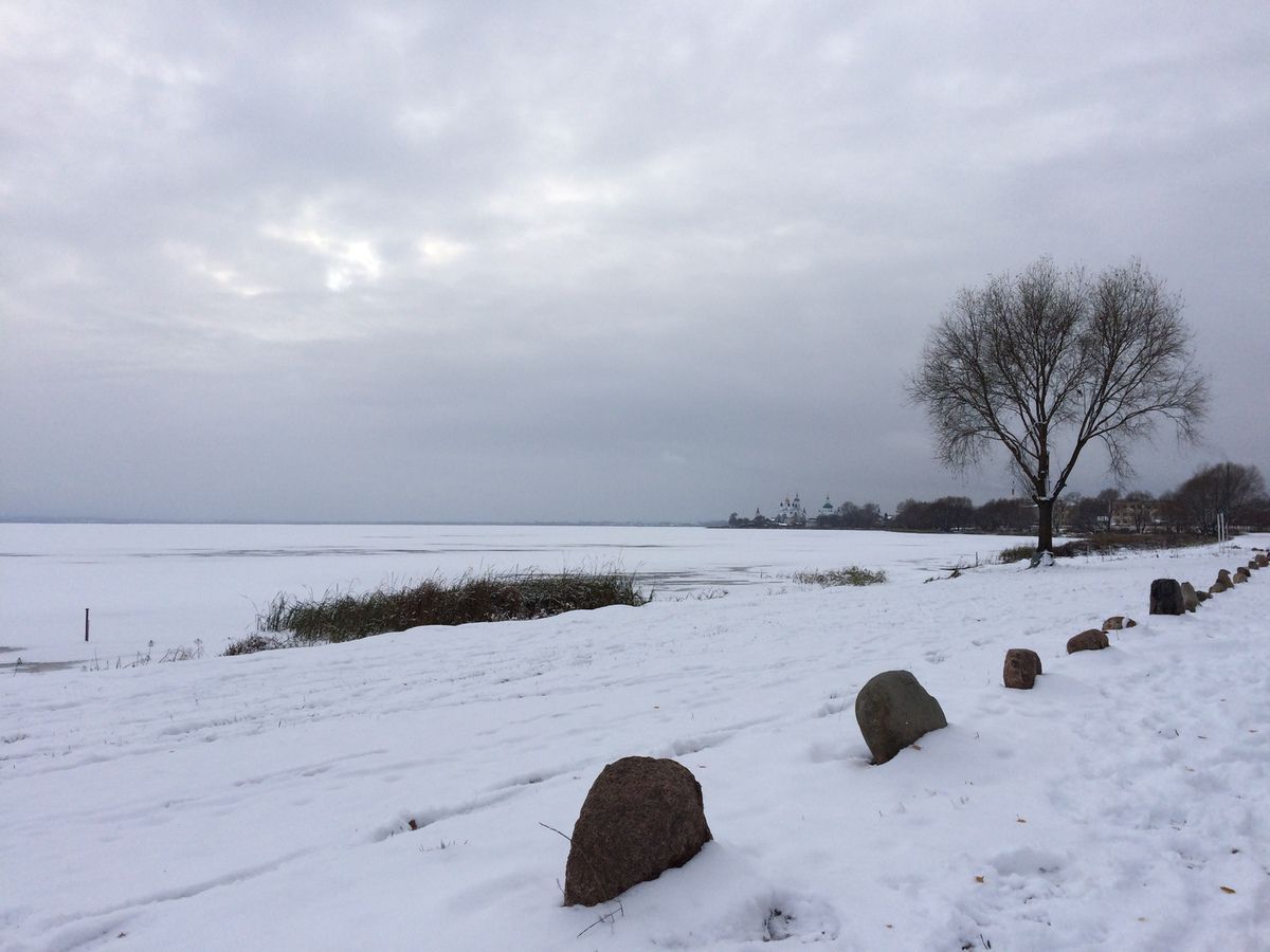 Une fois réchauffées, nous repartons poursuivre notre visite. Cette fois-ci, nous sortons du Kremlin pour aller voir le lac Nero qui s’étend aux pieds du Kremlin. Avec Aurélie, nous avions repéré ce lac dans le guide et c’est avec une grande joie que nous découvrons cette immense étendue gelée et enneigée. Après maintes glissades, nous parvenons aux abords du lac.