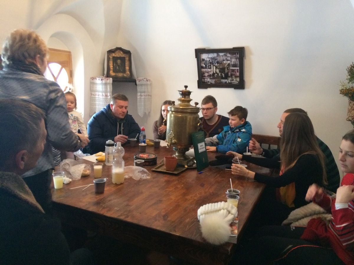 Au fond du jardin du Kremlin se dresse un petit pavillon dont nous franchissons les portes sans plus attendre. A l’intérieur, deux étages : au premier, une babouchka vend des boissons chaudes, au deuxième une toute petite salle en bois offre aux visiteurs une table carrée au milieu de laquelle se dresse un samovar. Aurélie commande un thé, je choisis de l’hydromel et nous montons nous asseoir autour de la table, aux côtés d’une famille russe venue ici, comme nous, pour se réchauffer. Amusées et charmées par ce moment de convivialité typiquement russe, nous observons la scène et les Russes sourient d’entendre du français.